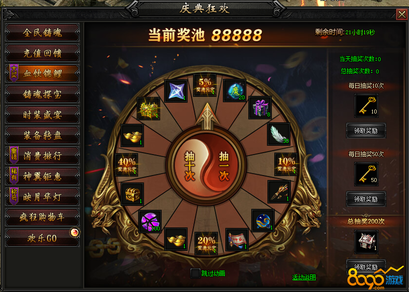 活动内容:活动期间,血饮锦鲤奖池投放海量元宝!参与大转盘必得珍贵道具,更有概率获得高额元宝奖励~