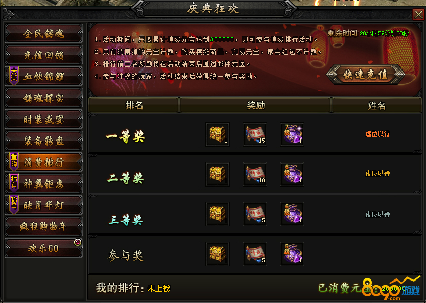 活动内容:活动期间,累计消费达到300000元宝即可参与消费排行活动,上榜玩家可获得专属奖励,稀有暴伤灵石、高转本职业极品装备震撼登场!