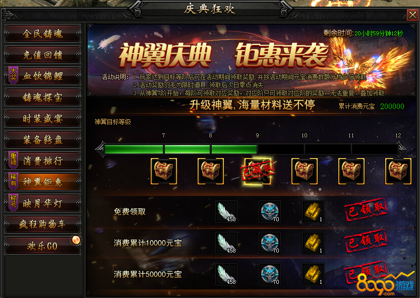 活动内容:活动期间内玩家达到指定神翼等级,可领取对应奖励获得大量羽毛,并按照活动期间内元宝消费数额分多档领取,最高3倍领取哦!(领取羽毛仅限当天有效)