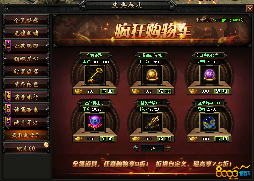 活动内容:活动期间,限时开启疯狂购物车,海量商城道具、稀有道具打折直售,全场9折起,最高享受7.5折!