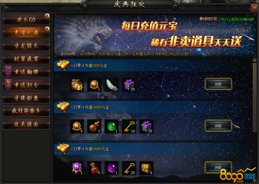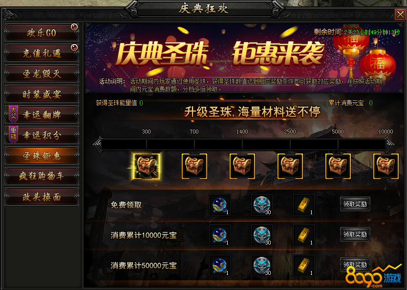 活动内容:活动期间内获得一定圣珠值,可领取对应奖励,并按照活动期间内元宝消费数额分多档领取,最高3倍领取哦!