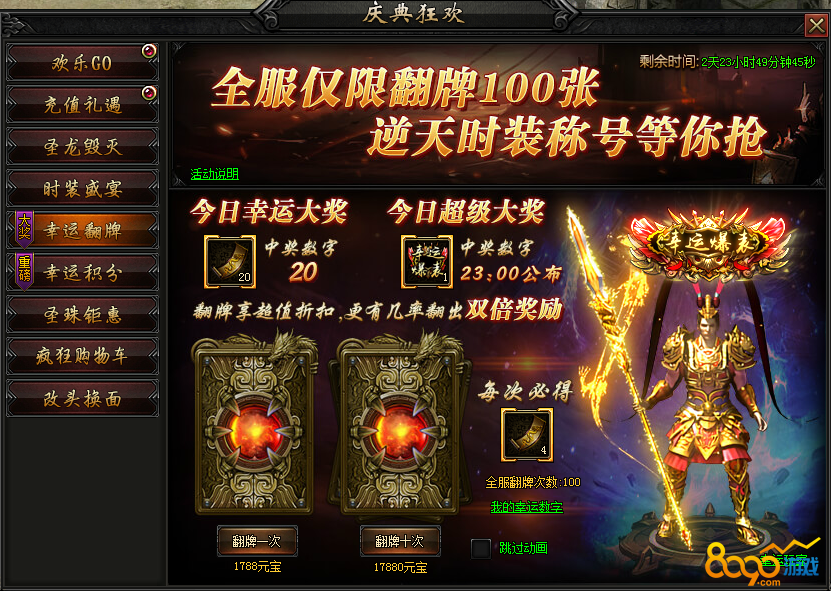 活动内容:全服仅限翻牌100张,逆天时装、称号超级大奖,还有幸运大奖等你来抢。