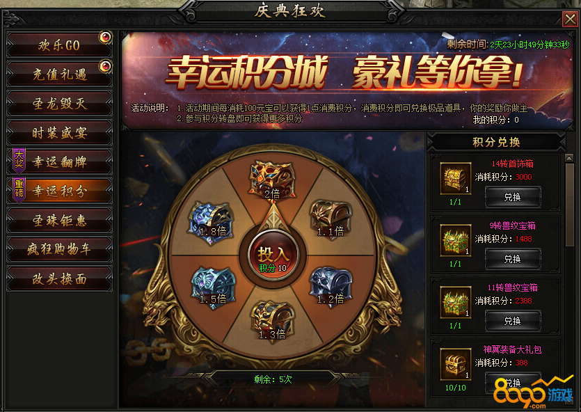活动内容:活动期间,消费元宝可以额外获得积分,可以参与转盘获得多倍积分,兑换大量稀有道具奖励!