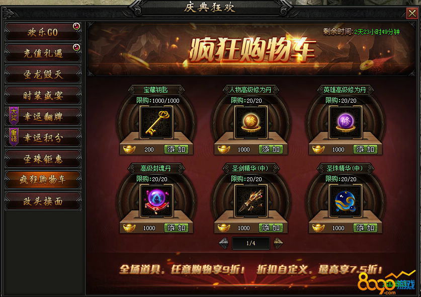 活动内容:活动期间,限时开启疯狂购物车,海量商城道具、稀有道具打折直售,全场9折起,最高享受7.5折!