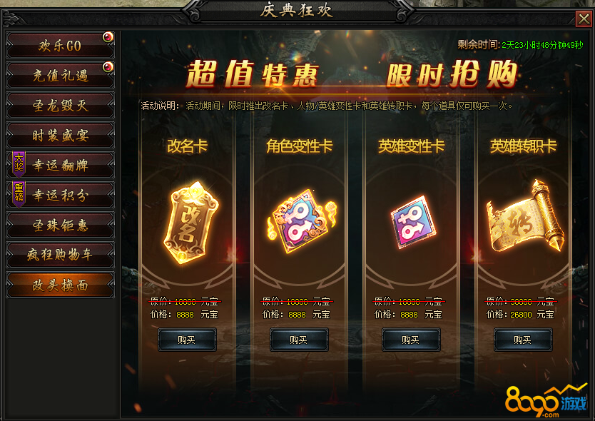 活动内容:活动期间,限时推出改名卡,人物/英雄变性卡和英雄转职卡,每个道具仅可购买一次。
