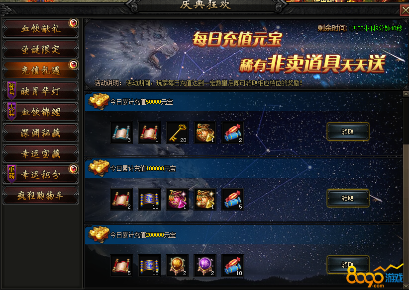 活动内容:活动期间,每日充值达到一定额度后可领取相应充值奖励。