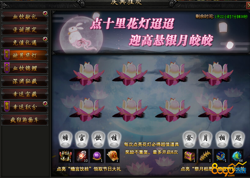 活动内容:活动期间,花费元宝每次点亮花灯必得超值道具,奖励不重复,最多开启8次
