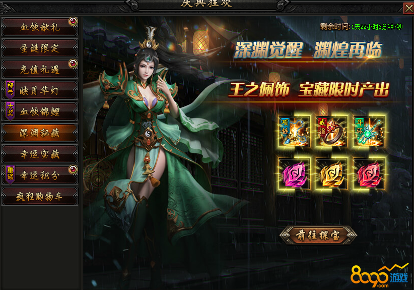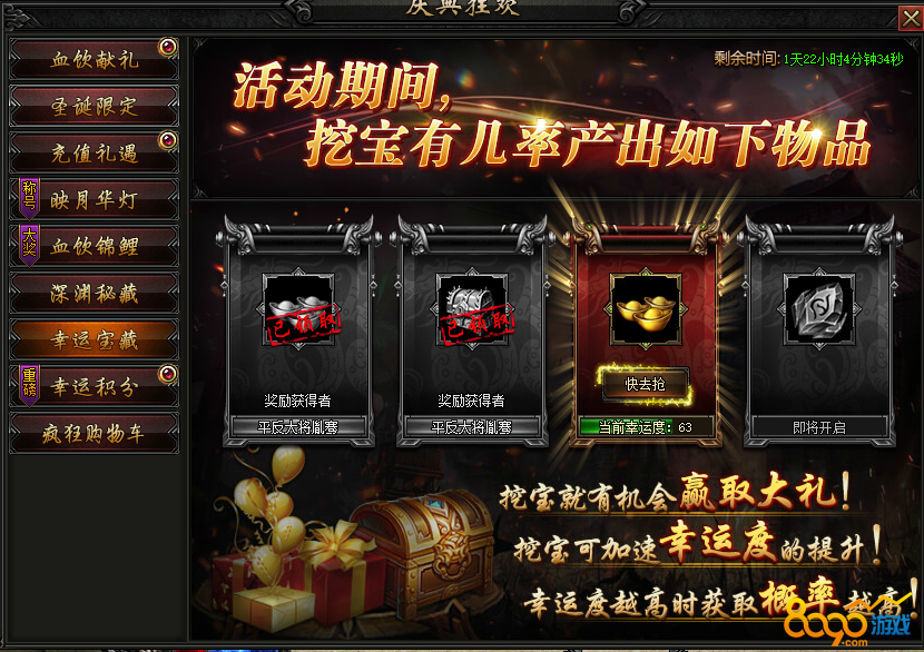 活动内容:活动期间,宝藏有几率额外产出海量元宝及稀有道具!额外幸运,额外大奖,等您来抢哦~