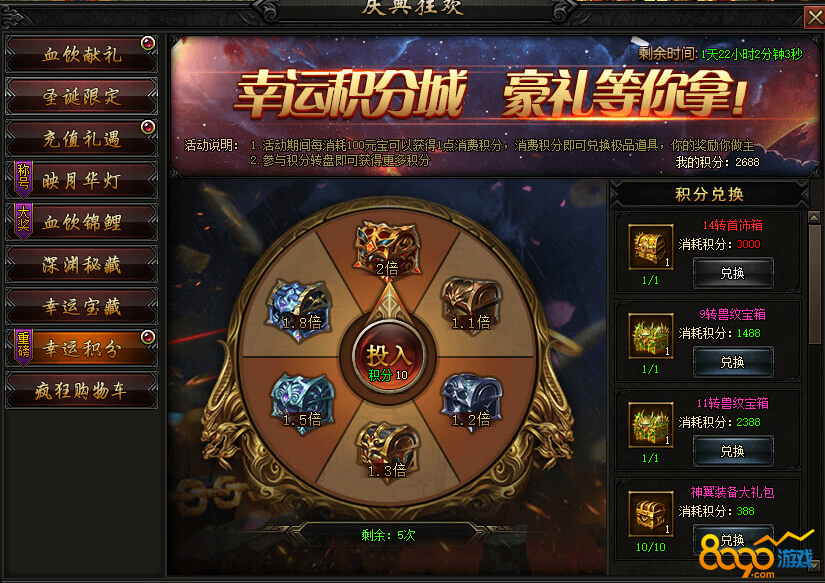 活动内容:活动期间,消费元宝可以额外获得积分,可以参与转盘获得多倍积分,兑换大量稀有道具奖励!