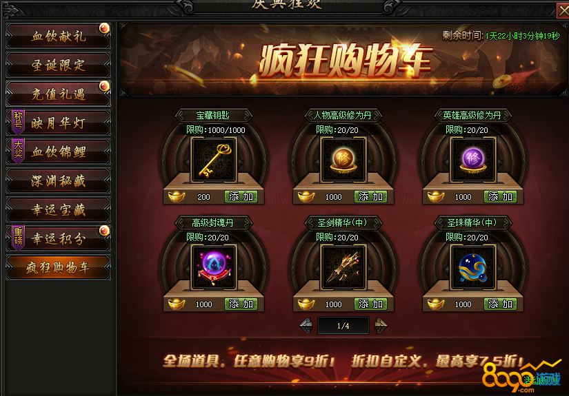活动内容:活动期间,限时开启疯狂购物车,海量商城道具、稀有道具打折直售,全场9折起,最高享受7.5折!