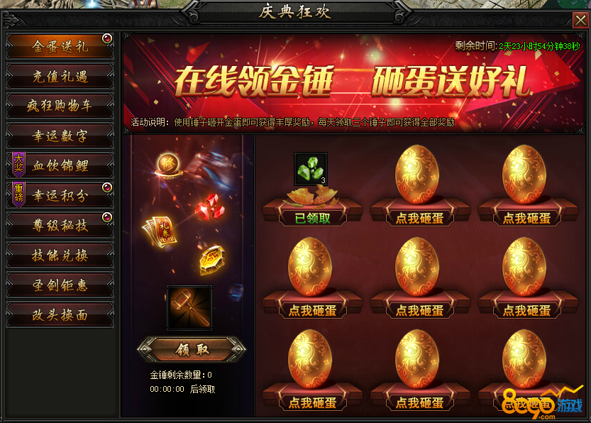 活动内容:活动期间,只需登录、保持在线即可免费领取庆典金锤,每天砸蛋送好礼,“蛋”无虚发~