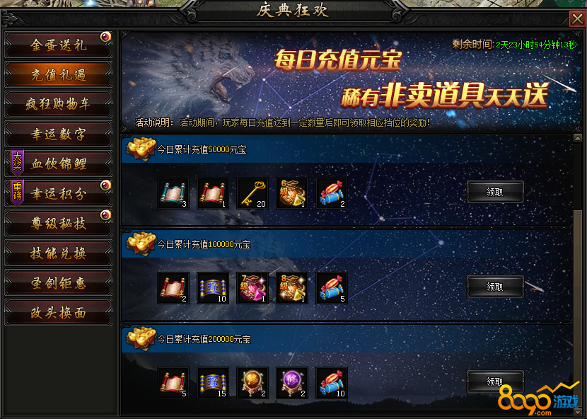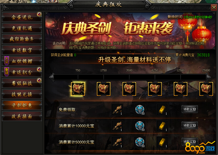 活动内容:活动期间内获得一定圣剑值,可领取对应奖励,并按照活动期间内元宝消费数额分多档领取,最高3倍领取哦!