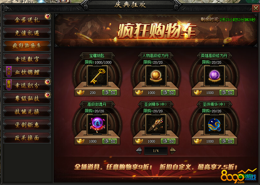 活动内容:活动期间,限时开启疯狂购物车,海量商城道具、稀有道具打折直售,全场9折起,最高享受7.5折!