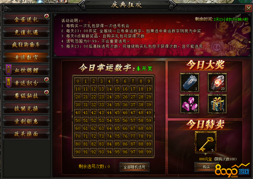 活动内容:活动期间,推出指定道具限时折扣出售,购买额外获得幸运数字,全服共100个数字,随机开一个,幸运玩家可得大量稀有奖励!