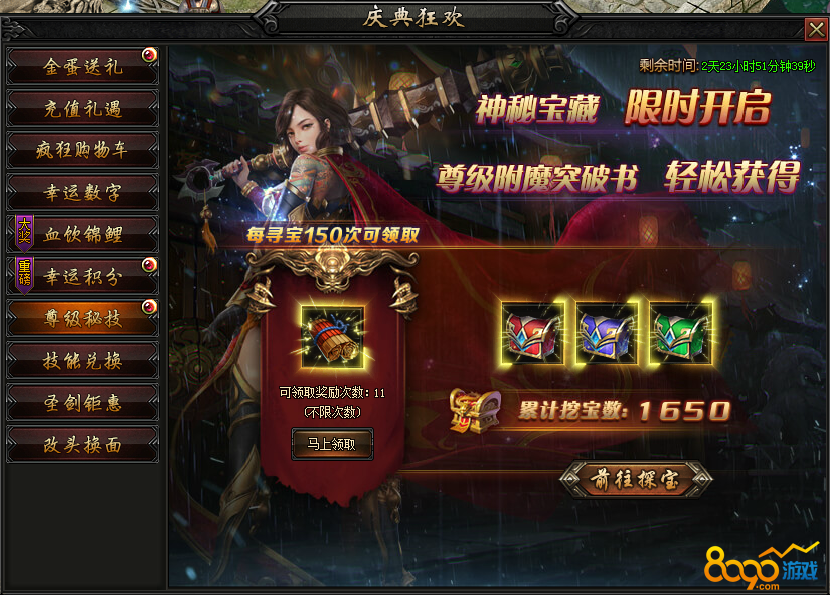活动内容:神秘宝藏,限时开启!尊级附魔突破书强力助阵,每日寻宝还能额外赠送稀有奖励