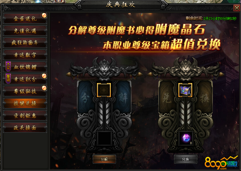 活动内容:活动期间,多余尊级附魔书可进行分解必得附魔晶石,用于兑换本职业尊级附魔箱~