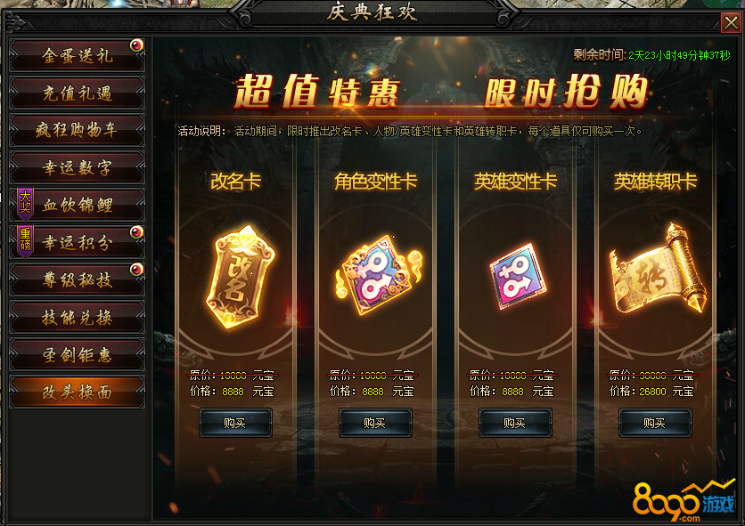 活动内容:活动期间,限时推出改名卡,人物/英雄变性卡和英雄转职卡,每个道具仅可购买一次。