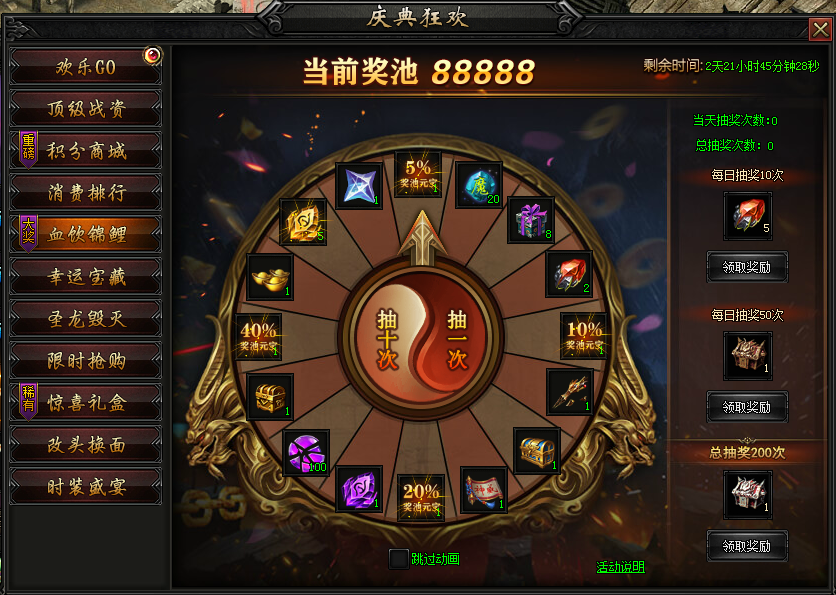活动内容:活动期间,每天可以免费参与抽奖,打BOSS收集庆典币可以获得更多抽奖次数,惊喜奖励摇出来~