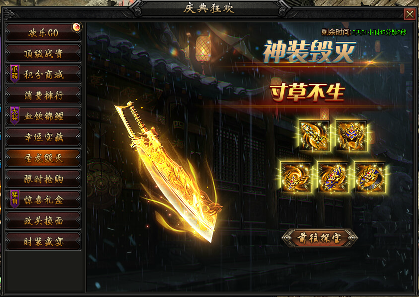 活动内容:圣龙毁灭套装,限时开启!活动期间寻宝概率产出圣龙装备毁灭部位~