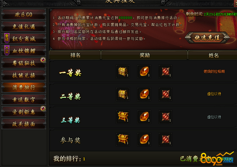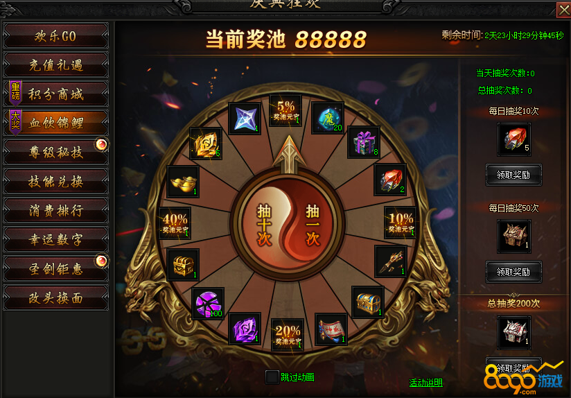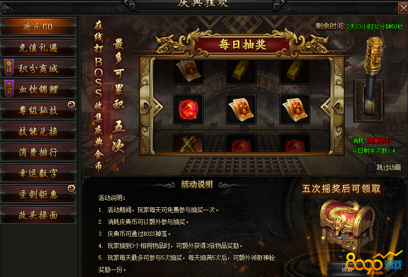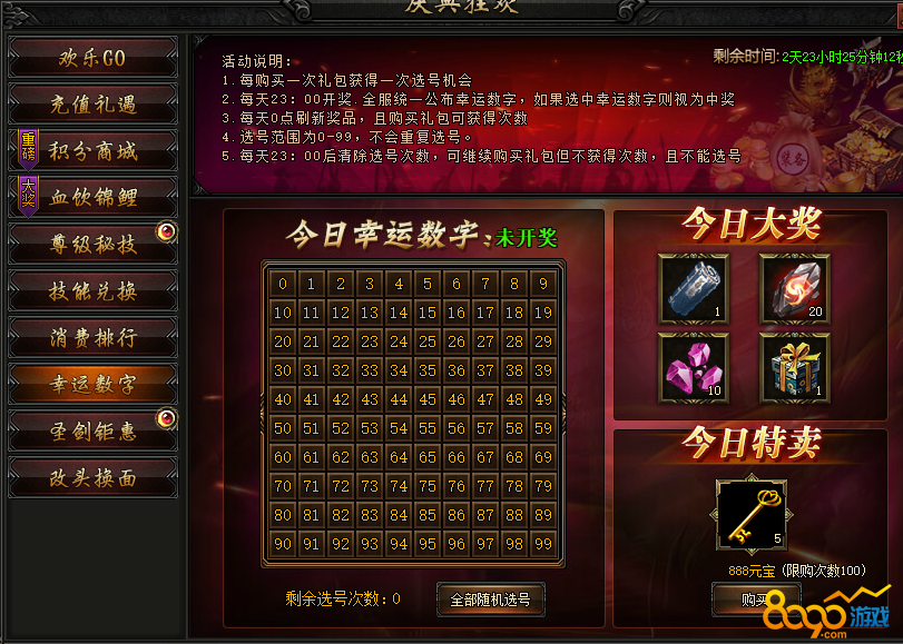 活动内容:消耗元宝购买礼包,选取数字等待大奖开启