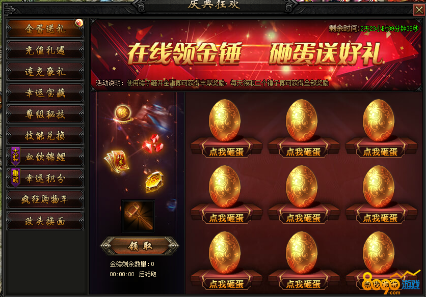 活动内容:活动期间,只需登录、保持在线即可免费领取庆典金锤,每天砸蛋送好礼,“蛋”无虚发~.