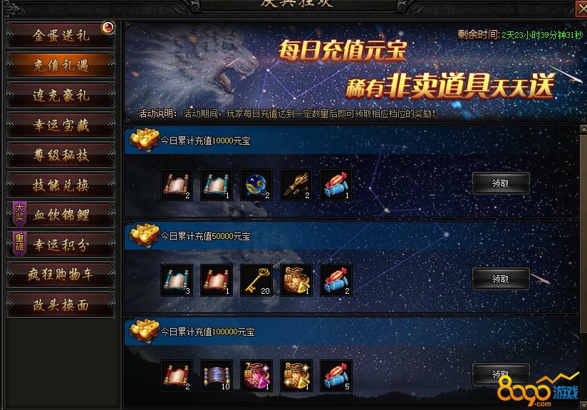 活动内容:活动期间,每日充值达到一定额度后可额外领取相应档位的充值回馈。