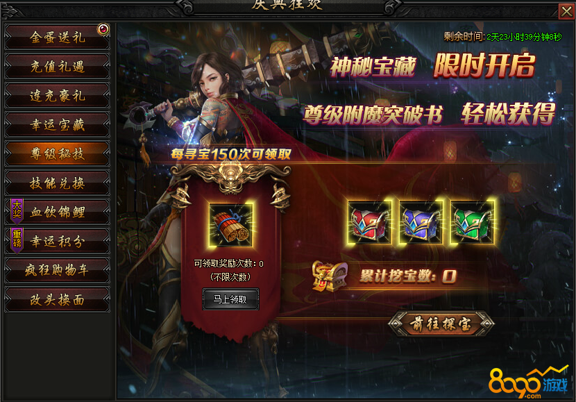 活动内容:活动期间,宝藏有几率额外产出海量元宝及极品本职业装备!额外幸运,额外大奖,等您来抢哦~