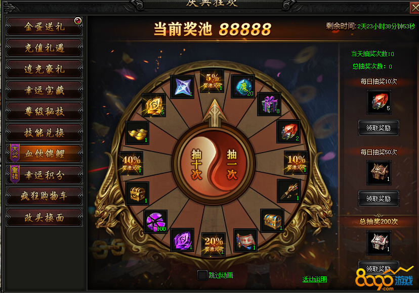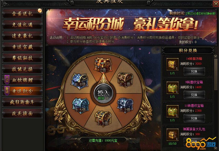活动内容:活动期间,消费元宝可以额外获得积分,可以参与转盘获得多倍积分,兑换大量稀有道具奖励!