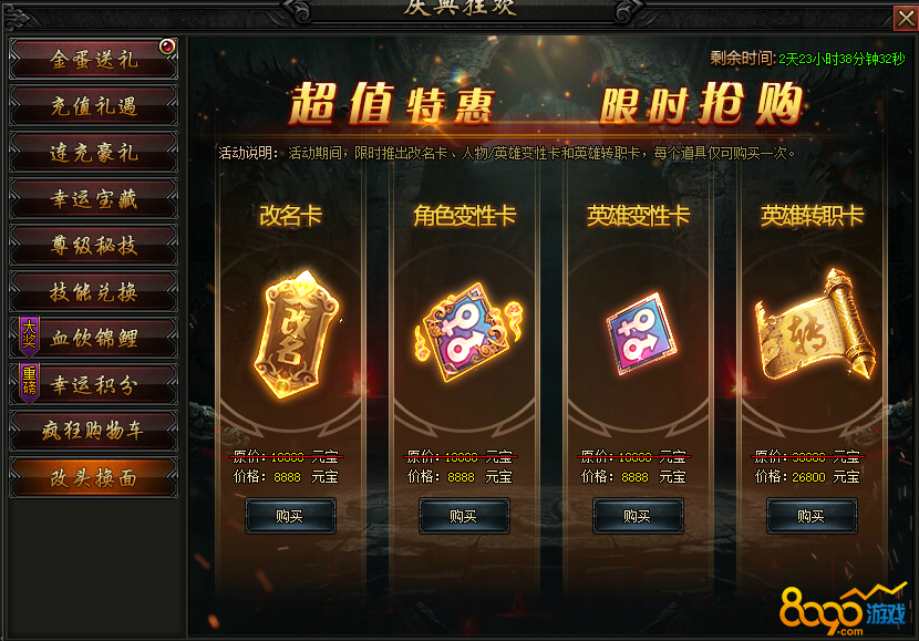 活动内容:活动期间,限时推出改名卡,人物/英雄变性卡和英雄转职卡,每个道具仅可购 买一次。