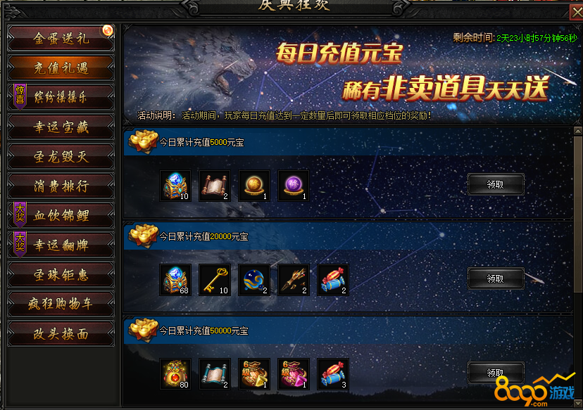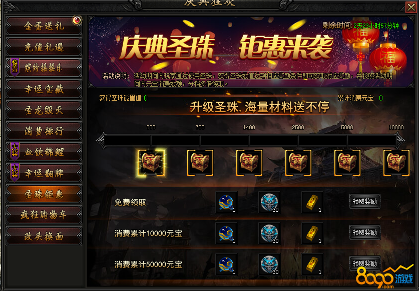 活动内容:活动期间内获得一定圣珠值,可领取对应奖励,并按照活动期间内元宝消费数额分多档领取,最高3倍领取哦!