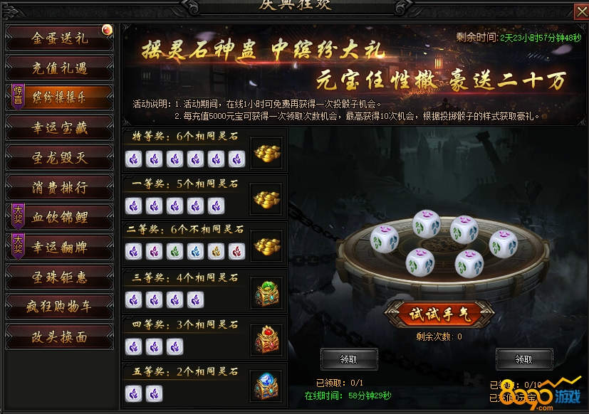 活动内容:幸运摇摇乐,精品灵石礼包,大量元宝福利等你获取噢!