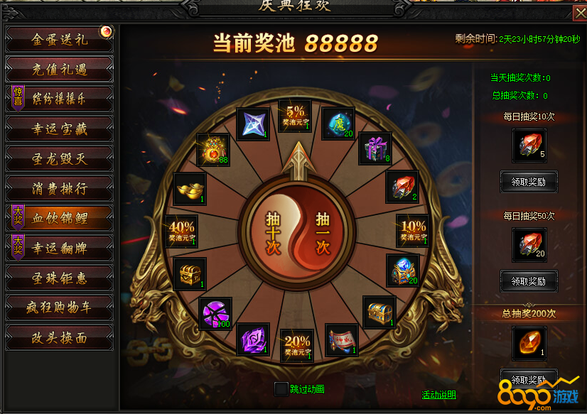 活动内容:活动期间,血饮锦鲤奖池投放海量元宝!参与大转盘必得珍贵道具,更有概率获得高额元宝奖励~