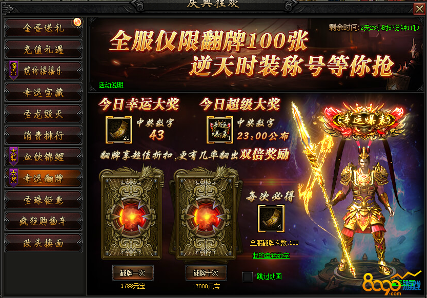 活动内容:全服仅限翻牌100张,逆天时装、称号超级大奖,还有幸运大奖等你来抢。