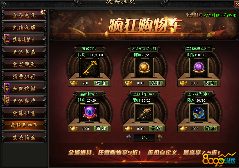活动内容:活动期间,限时开启疯狂购物车,海量商城道具、稀有道具打折直售,全场9折起,最高享受7.5折!