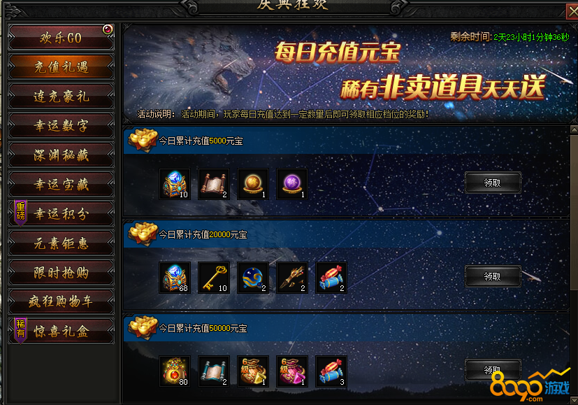 活动内容:活动期间,每日充值达到一定额度后可额外领取相应档位的充值回馈。