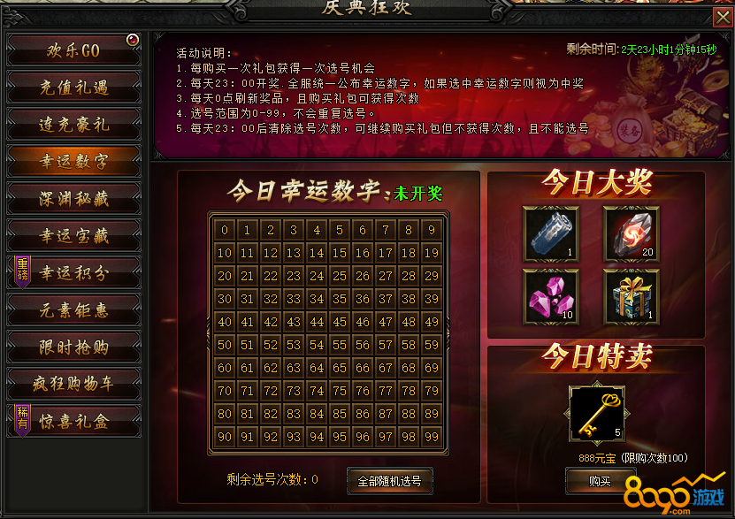 活动内容:活动期间,推出指定道具限时折扣出 售,购 买额外获得幸运数字,全服共100个数字,随机开一个,幸运玩家可得大量稀有奖励!