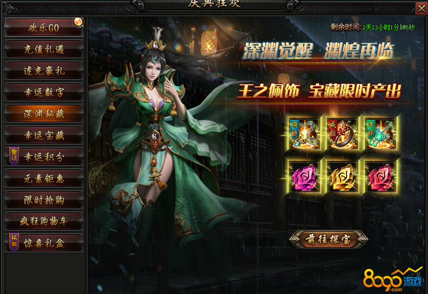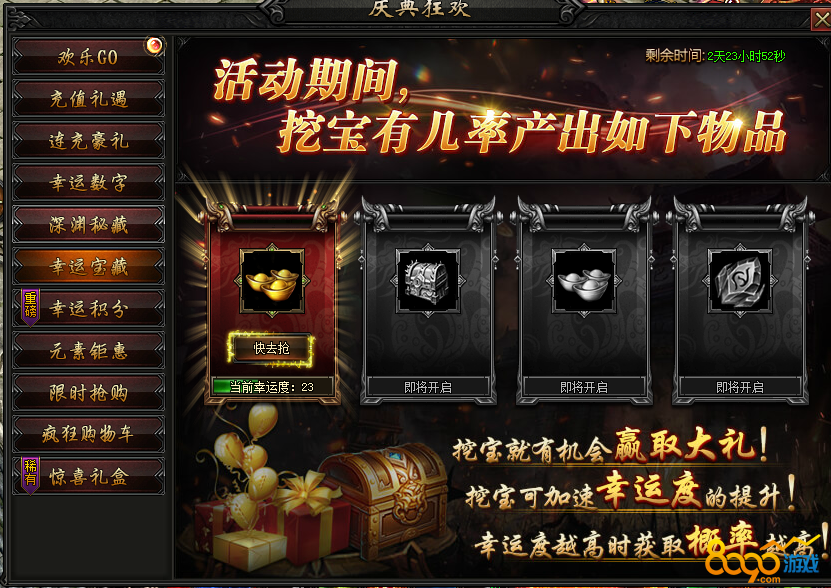 活动内容:活动期间,宝藏有几率额外产出海量元宝及高转极品本职业装备!额外幸运,额外大奖,等您来抢哦~