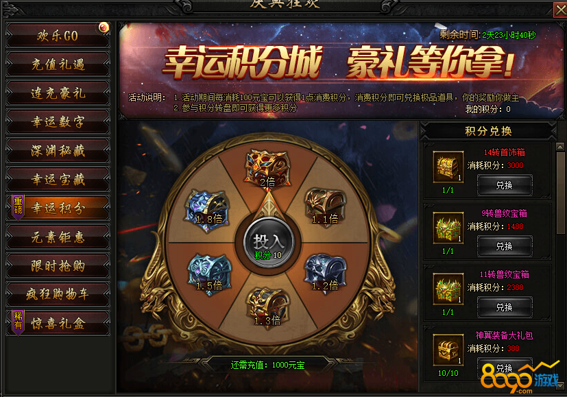 活动内容:活动期间,消费元宝可以额外获得积分,可以参与转盘获得多倍积分,兑换大量稀有道具奖励!