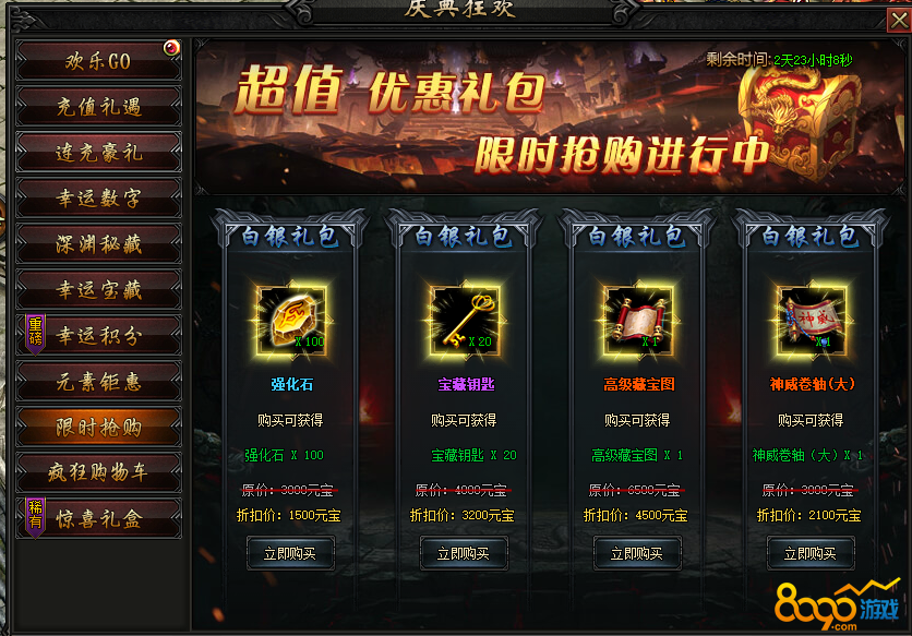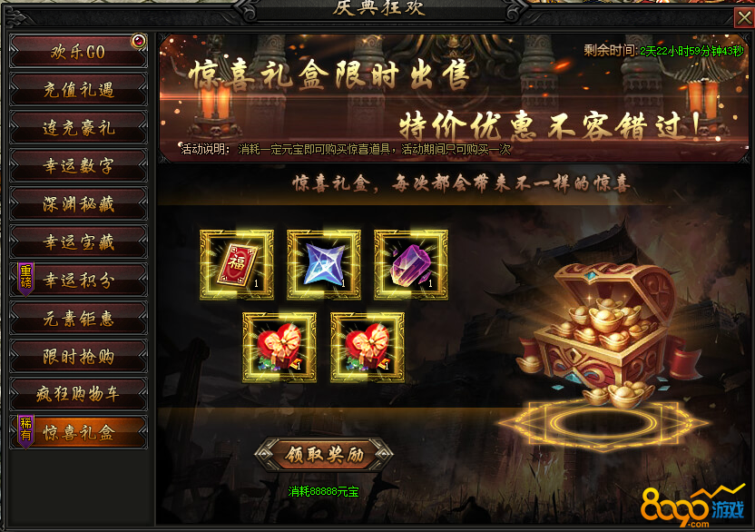 活动内容:活动期间,花费88888元宝购买,惊喜道具特价出售!