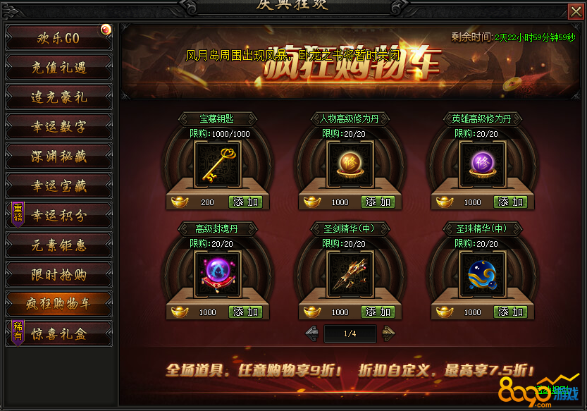 活动内容:活动期间,限时开启疯狂购物车,海量商城道具、稀有道具打折直售,全场9折起,最高享受7.5折!