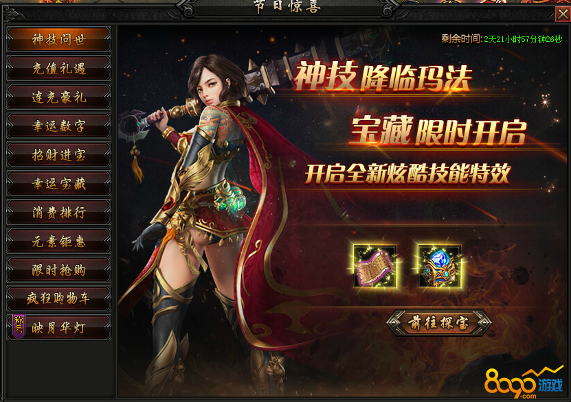 活动内容:活动期间,宝藏有几率额外产出海量元宝及高转极品本职业装备!额外幸运,额外大奖,等您来抢哦~