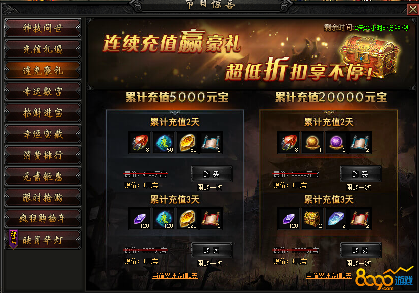 活动内容:活动期间,完成连续充值,赢取连充豪礼!