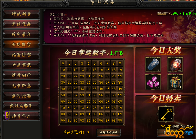 活动内容:活动期间,推出指定道具限时折扣出 售,购 买额外获得幸运数字,全服共100个数字,随机开一个,幸运玩家可得大量稀有奖励!