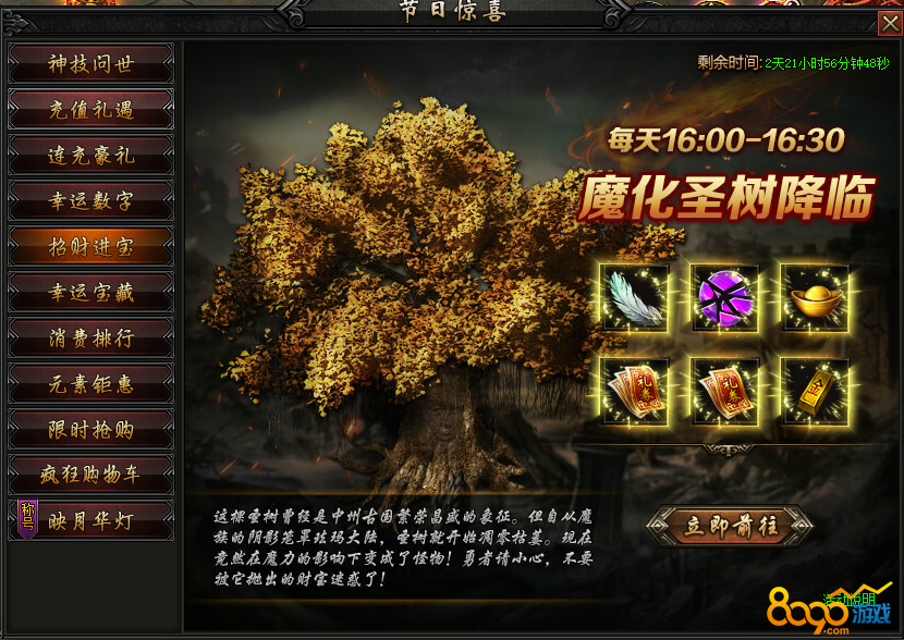 活动内容:活动期间,每天16:00-16:30魔化圣树降临,BOSS每掉血25%会掉落大量金砖、羽毛、元宝、灵器精华等奖励!