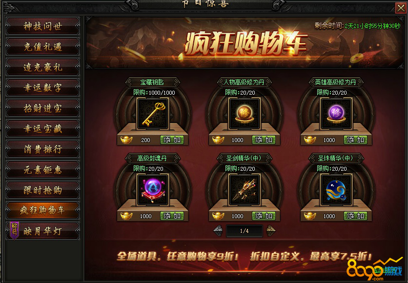 活动内容:活动期间,限时开启疯狂购物车,海量商城道具、稀有道具打折直售,全场9折起,最高享受7.5折!