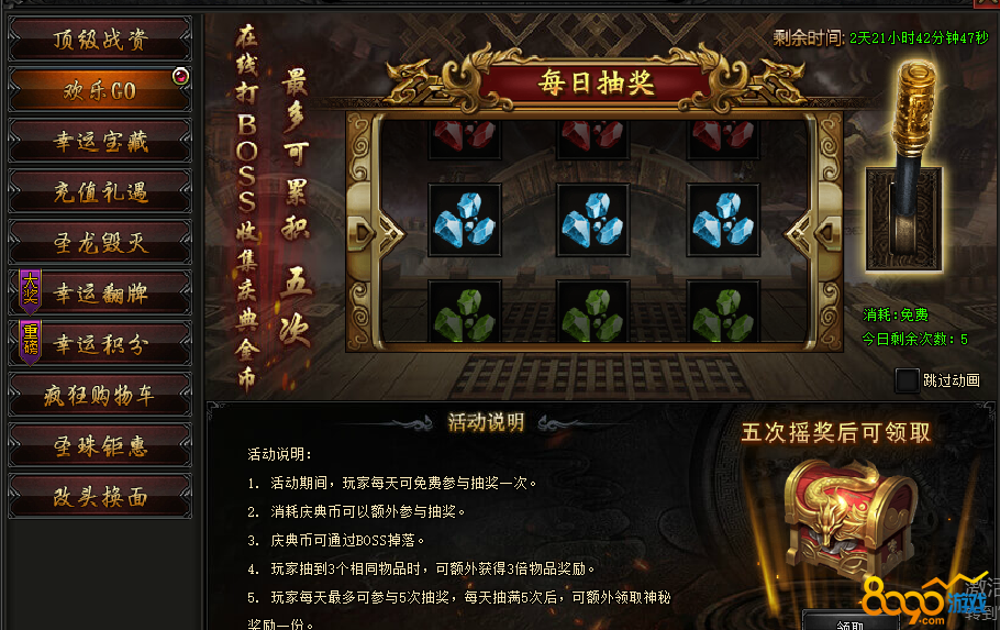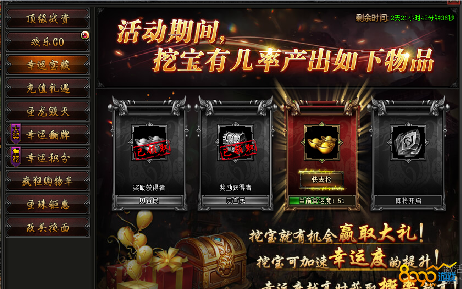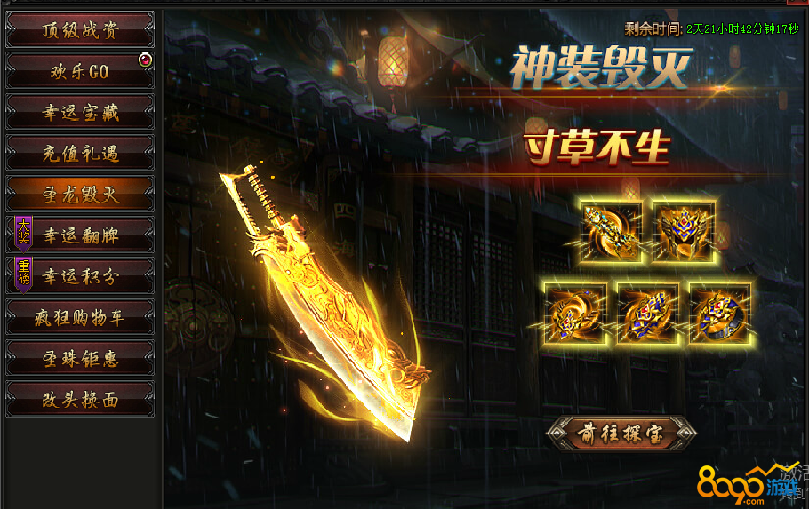活动内容:活动期间,宝藏有几率产出圣龙毁灭装备,战力狂升!