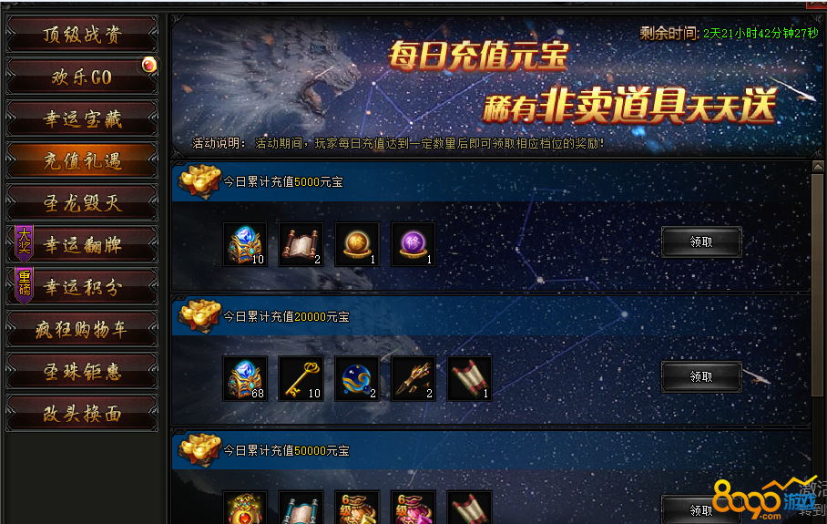 活动内容:活动期间,累计充值元宝,领取稀有豪礼