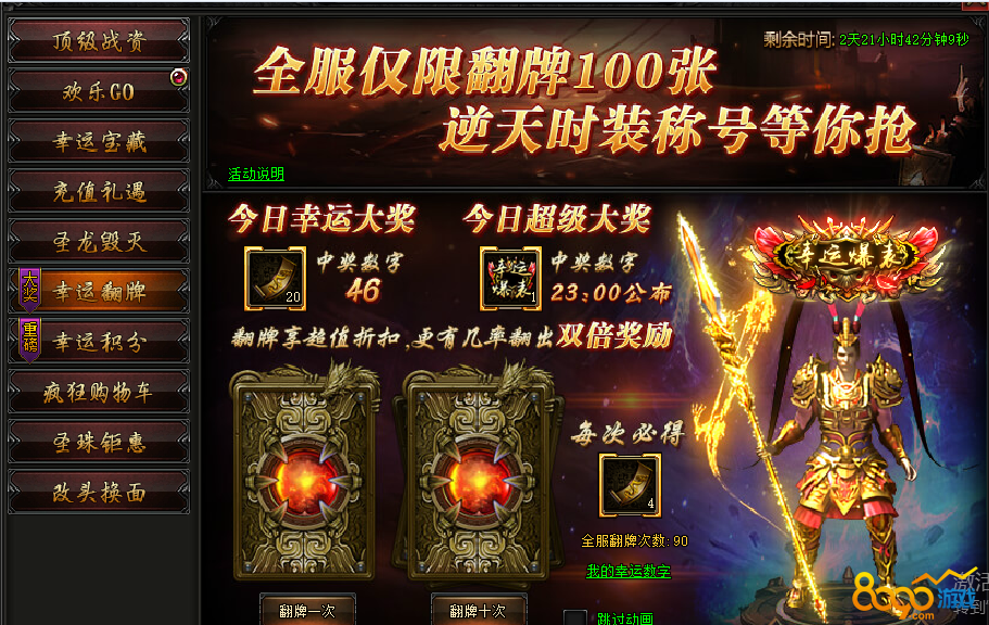 活动内容:全服仅限翻牌100张,逆天时装、称号超级大奖,还有幸运大奖等你来抢。