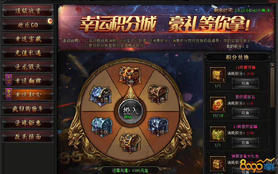 活动内容:活动期间,消费元宝可以额外获得积分,可以参与转盘获得多倍积分,兑换大量稀有道具奖励!