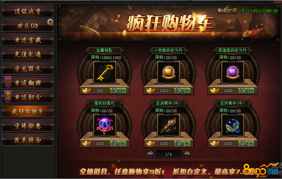 活动内容:活动期间,限时开启疯狂购物车,海量商城道具、稀有道具打折直售,全场9折起,最高享受7.5折!